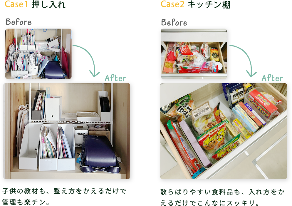 せっかく暮らしやすいしくみづくりができても、ママだけで維持することは簡単ではありません。子どもが自分ででき、パパも協力しやすい、ご家族みんなで続けやすいお片付けを積極的にご提案します。